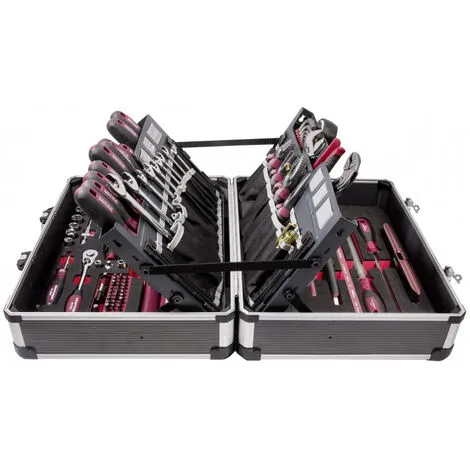 - Le couvercle du coffret et le fond du boîtier peuvent être complètement repliés et deux panneaux d’outils mobiles s’ouvrent à l’intérieur comme un intercalaire.